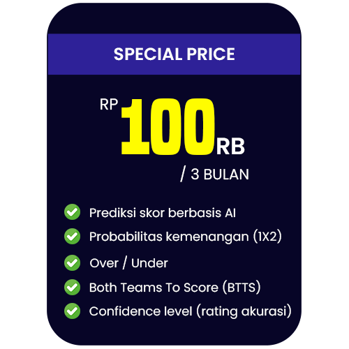 Nikmati akses penuh ke seluruh prediksi berbasis AI, analisis statistik mendalam, dan update pertandingan harian dengan pilihan paket fleksibel sesuai kebutuhan Anda.